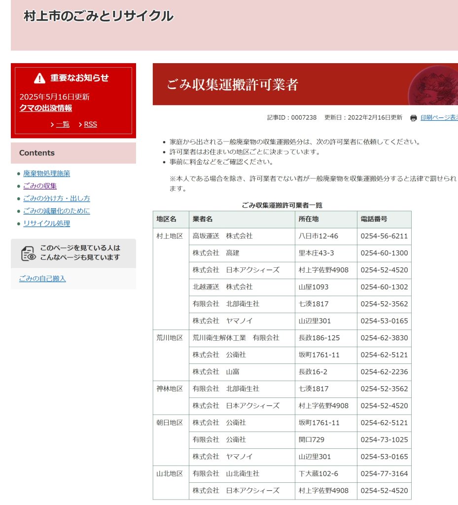このように、ほとんどの自治体のホームページには、一般廃棄物に関わる許可業者の一覧が公開されています。地域によっては、許可区域が業者ごとに細かく指定されていることがあります。お住まいの地域に該当する業者が分からない場合は、自治体の担当部署に問い合わせてみましょう。