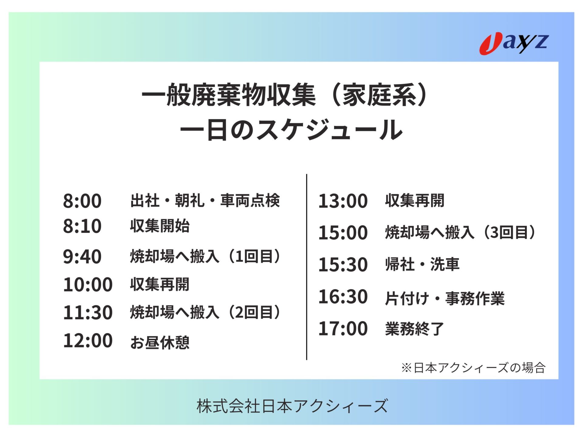 一般廃棄物の収集は、ごみ処理場への搬入時間が決まっているため、基本的にその時間内に業務を行います。搬入時間を過ぎてしまったら、どんなに収集しても廃棄物の積み下ろしをする場所がないため、残業をしてもそれほどメリットがありません。