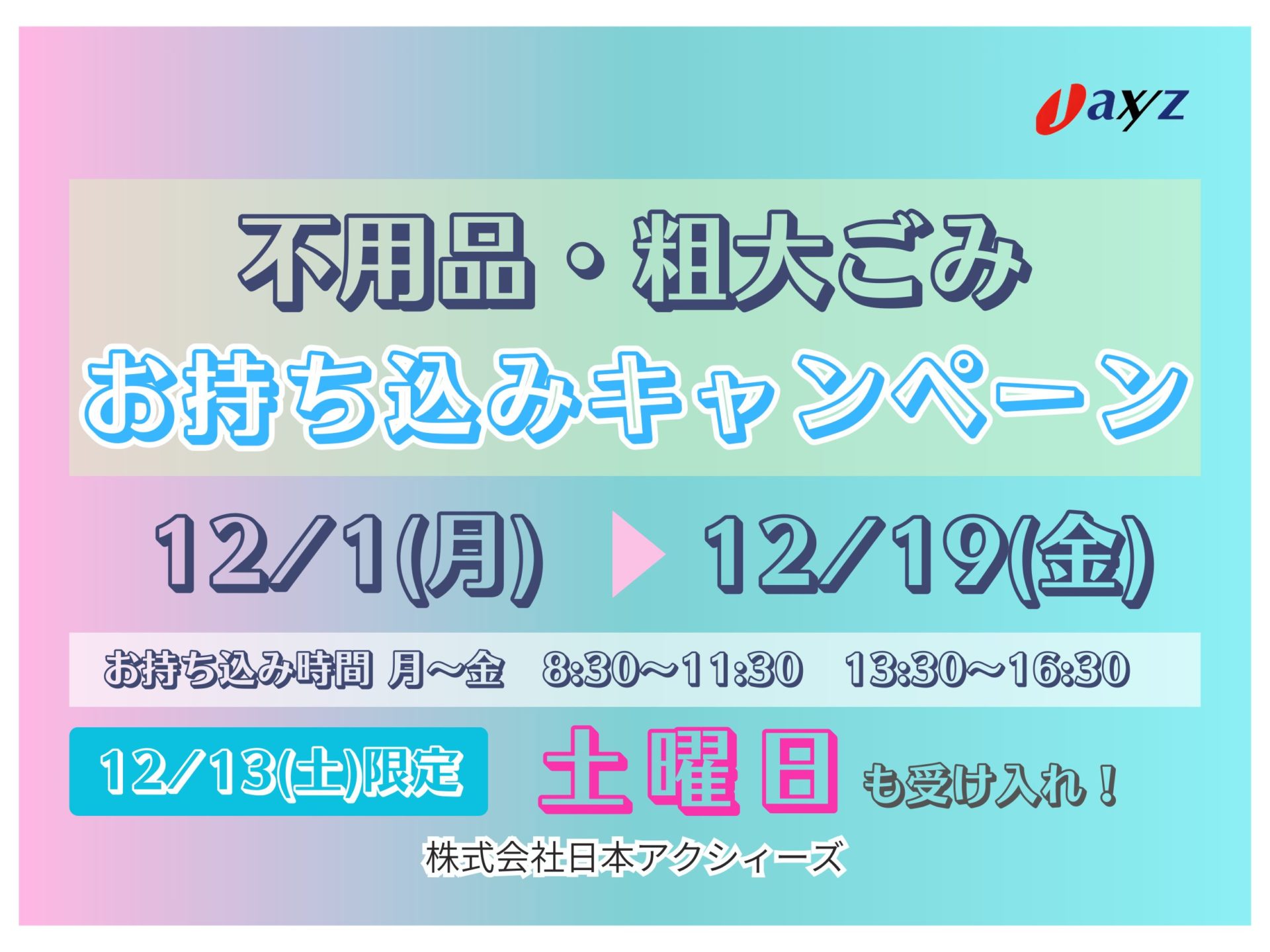 年末の大掃除シーズンに合わせたお得なキャンペーンです。この機会にご不要な品々の処分をご検討ください。皆様のご来場をお待ちしております。