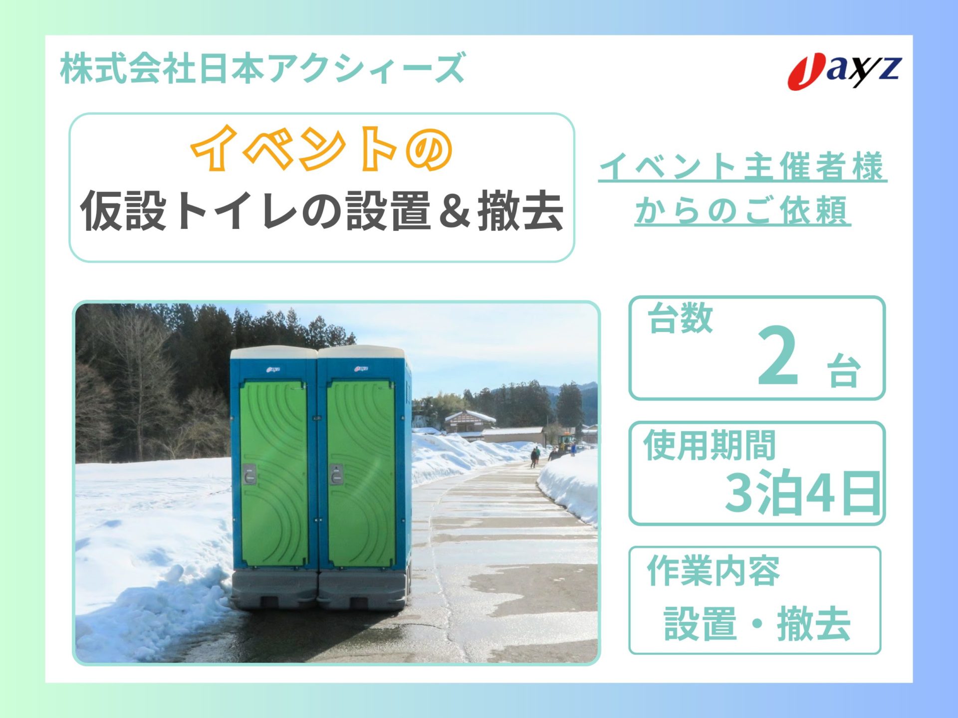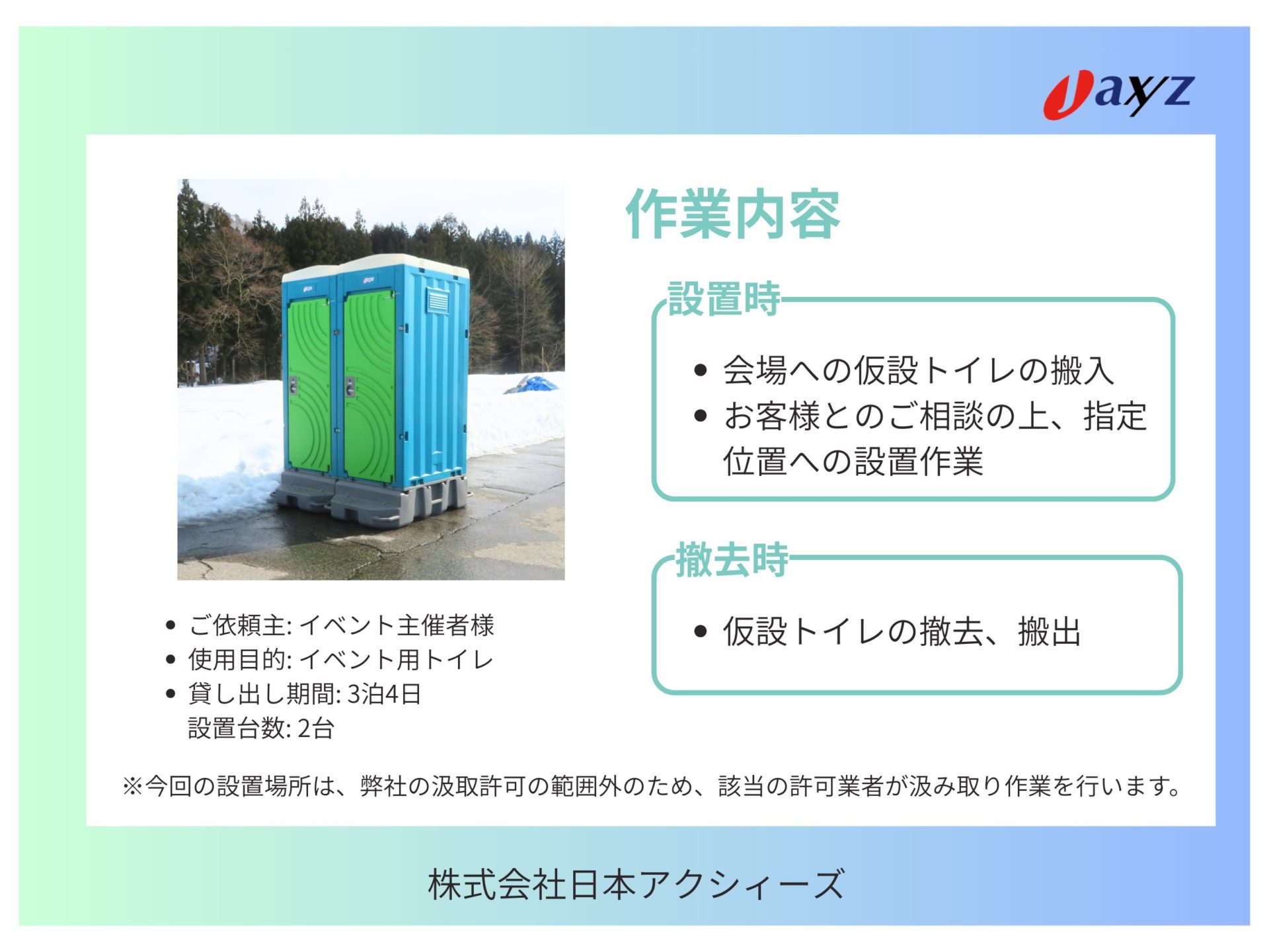 日本アクシィーズは、村上市を中心に仮設トイレのレンタルサービスを行っています。